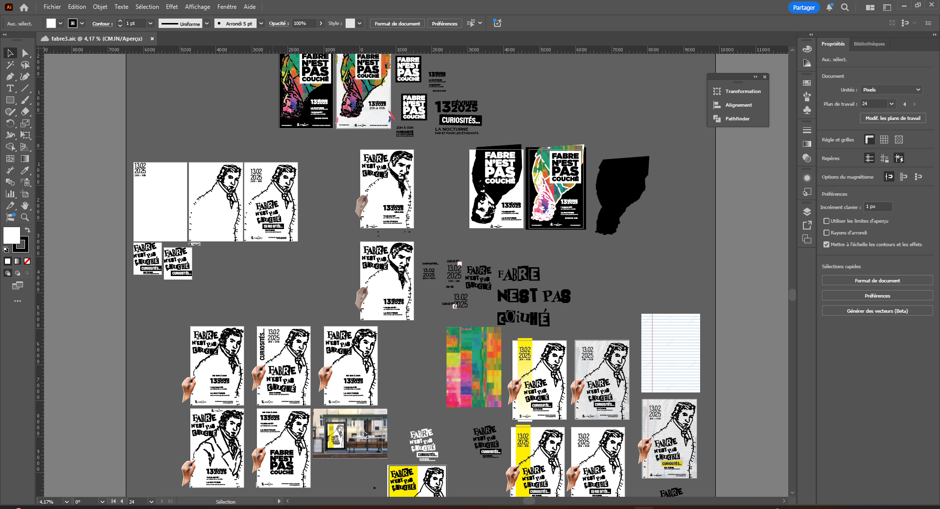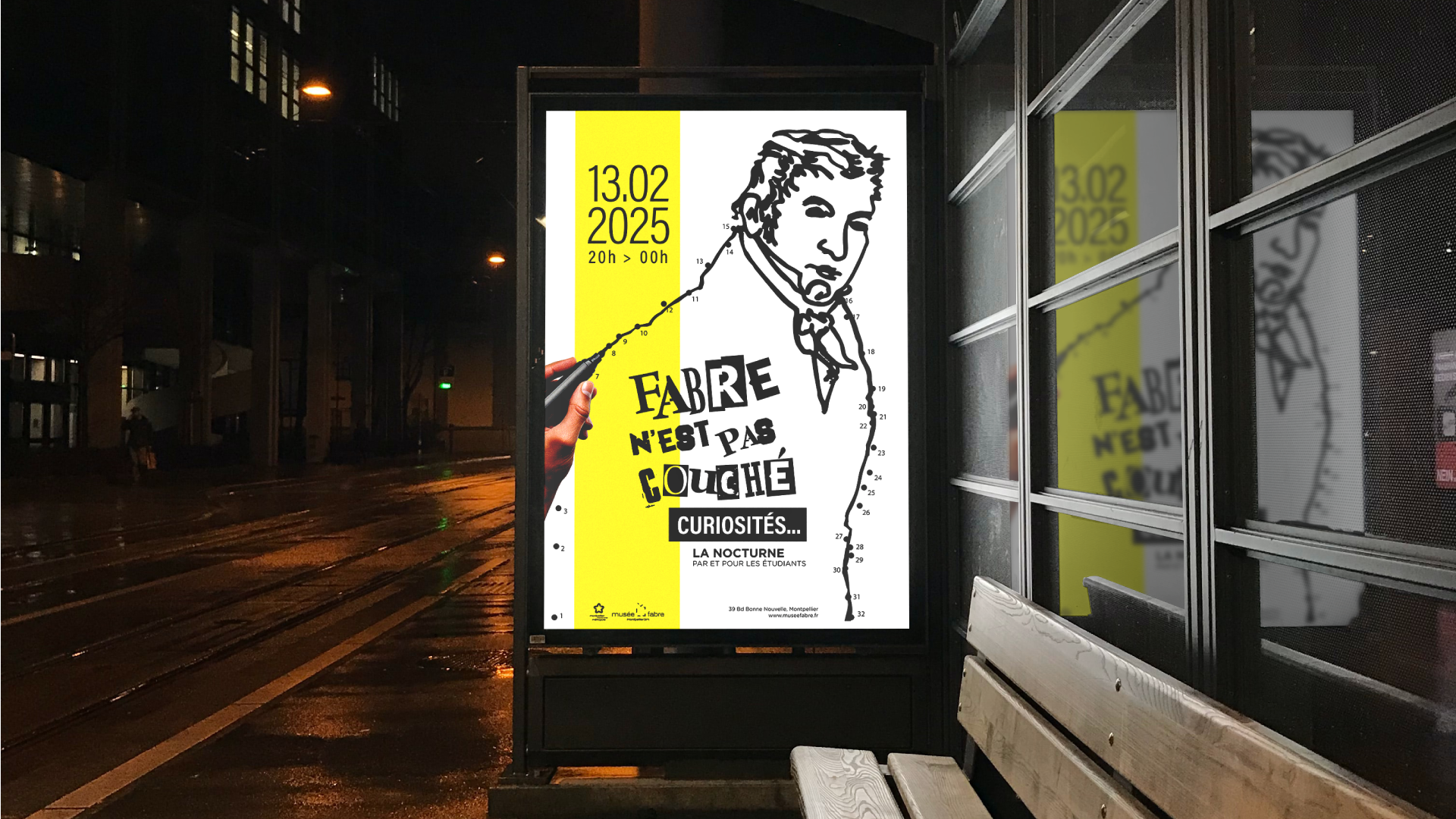Affiche conçue pour l’édition 2025 de la Nocturne étudiante du Musée Fabre de Montpellier. Approche inspirée des dessins à relier, métaphore du parcours des visiteurs à travers les salles et ateliers. Le visuel allie sobriété institutionnelle et dynamisme, en accord avec l’image du musée et la cible étudiante.
